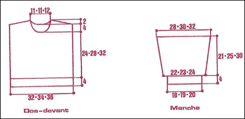 À 28 - 32 - 36 cm de haut. tot., rab. les 9 - 9 - 11 m. centrales. Term. ch. partie séparément en rab. côté encolure ts les 2 rgs 1 fs 3 m., 2 fs 2 m., 2 fs 1 m.
