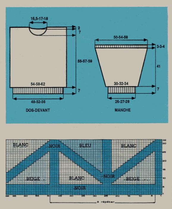 Monter 109 - 117 - 127 m. en noir. Tric. 7 cm en côtes 1/1. Cont. droit en jacquard en répart. 12 - 13 - 13 augm. au 1er rg.