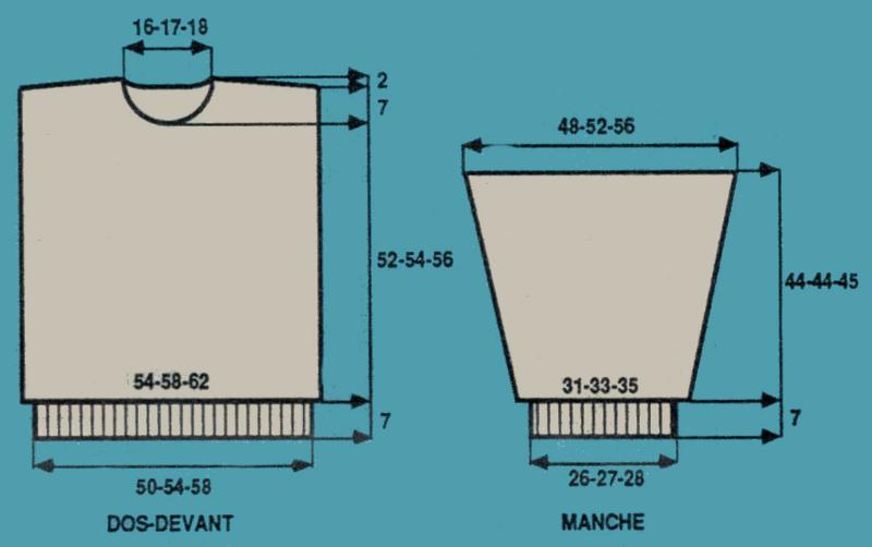 À 59 - 61 - 63 cm de haut. tot., rab. les 12 - 14 - 16 m. centrales. Term. ch. partie séparément en rab. côté encolure ts les 2 rgs: 1 fs 4 m., 3 fs 2 m., 4 fs 1 m.