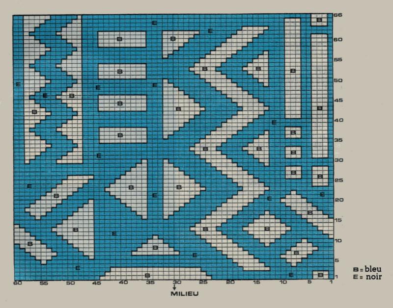 Jacquard: aig. # 3.5 mm, suivre la grille, après le 66ème rang, reprendre au 1er rang.