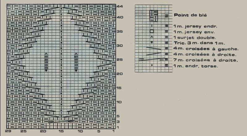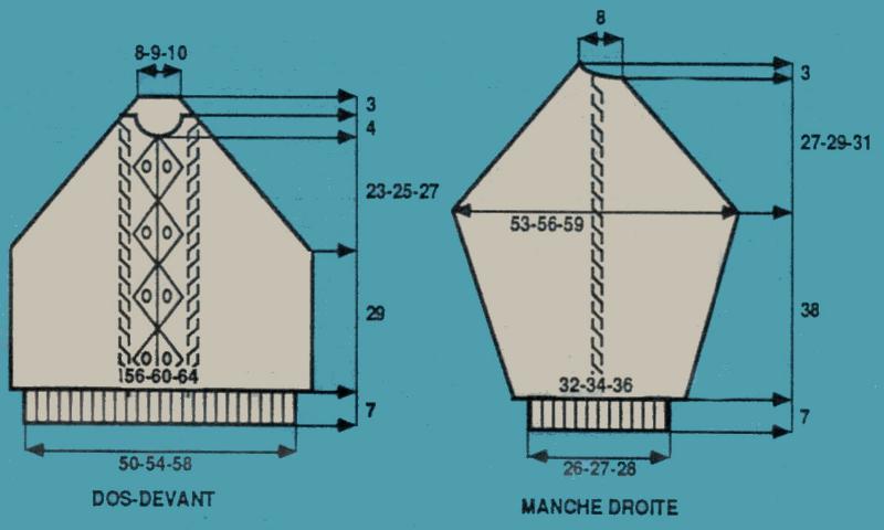 Monter 115 - 125 - 135 m. Tric. 7 cm en côtes 1/1 en répart. 26 augm. au dernier rang. Cont. droit comme suit sur les 141 - 151 - 161 m. obtenues: 39 - 44 - 49 m. au point de blé, 10 m. torsade droite, 7 m. point de blé, 29 m. losange, 7 m. point de blé, 10 m. torsade de gauche, 39 - 44 - 49 m. point de blé.