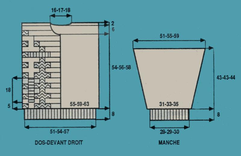 Monter 86 - 90 - 94 m. en beige. Tric. 8 cm en côtes 2/2 en répart. 5 - 7 - 11 augm. au dernier rg. Cont. droit au point fant. en beige sur les 91 - 97 - 105 m. obtenues en commençant: