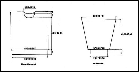 Monter 136 - 148 - 160 - 172 m. Tric. 7 cm côtes 2/2 en répart. 19 augm. au dernier rang. Cont. droit en fausses côtes anglaises sur les 155 - 167 - 179 - 191 mailles obtenues.