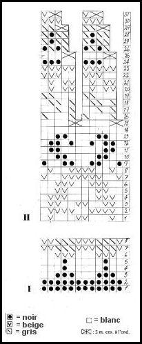 Monter 104 - 110 - 116 - 122 - 128 - 134 m. avec l'aig. circulaire longue # 4 avec la couleur beige. Fermer les mailles en rond, tric. 6 cm en côtes 1 m. endr., 1 m. env. Cont. avec l'aig. circulaire longue # 6 et avec la couleur noir. Au 1er tour au point jersey augm. 10 m. réparties, ça donne un total de mailles de 114 - 120 - 126 - 132 - 138 - 144 m. Puis tric. le point jacquard "grille I". Lorsque vous avez terminé la grille cont. en gris jusqu'à une hauteur de 40 - 41 - 43 - 45 - 47 - 50 cm. Ne pas tric. les dernières 4 - 4 - 4 - 5 - 5 - 5 m. du tour. Ne pas couper le fil, laisser les m. en attente, tric. d'abord les manches.