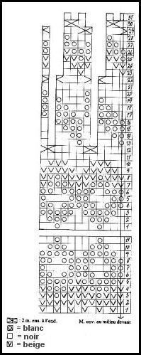 Monter 107 - 113 - 119 - 123 - 129 - 135 m. avec l'aig. circulaire longue # 4 et en noir. Tric. en allers et retours 6 cm en côtes 1/1 (commencer et terminer par 1 m. endr.). Cont. au point jersey avec l'aig. circulaire longue # 6, au 1er rg augm. 6 - 6 - 6 - 8 - 8 - 8 m. réparties (ne pas augm. sur la première et dernière m. du rang), au bout du rang, monter 1 m., fermer les m. en rond. La nouvelle m. est la première m. du tour, tric. cette m. toujours à l'envers. = 114 - 120 - 126 - 132 - 138 - 144 m. Tric. le point jacquard I en suivant la grille. Lorsque vous avez terminé la grille cont. en noir jusqu'à une hauteur de 40 - 41 - 43 - 45 - 47 - 50 cm. Laisser les mailles en attente. Tric. d'abord les manches.