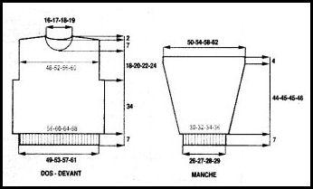À 18 - 20 - 22 - 24 cm de haut. d'emmanchures, rab. les 9 - 11 - 13 - 15 m. centrales. Cont. ch. côté séparément en rab. côté encolure ts les 2 rgs 1 fs 4 m., 1 fs 3 m., 1 fs 2 m., 2 fs 1 m.