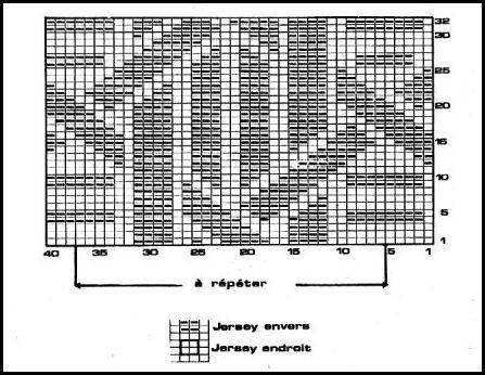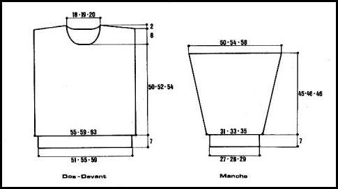 Monter 54 - 56 - 58 m. Tric. 7 cm côtes 2/2 en répart. 16 - 18 - 20 augm. au dernier rang. Cont. point fantaisie sur les 70 - 74 78 m. obtenues comme suit: