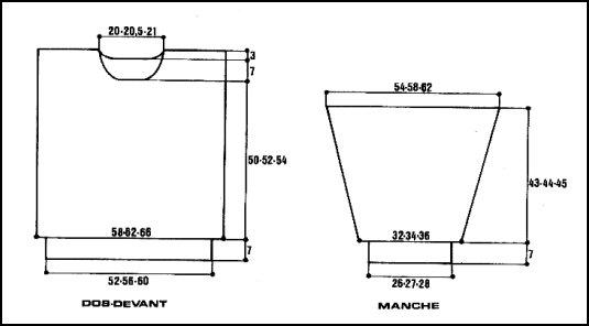 À 57 - 59 - 61 cm de haut. tot., rab. les 10 - 11 - 12 m. centrales. Cont. ch. côté séparément en rab. côté encolure ts les 2 rgs 1 fs 3 m., 1 fs 2 m., 4 fs 1 m.