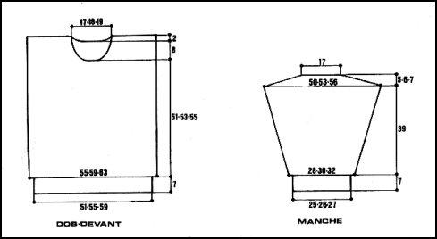 T.52: 1 m. lis., 8 m. triangle, 2 m. croisées, 3 m. env., 8 m. torsade, 3 m. env., 2 m. croisées, 8 m. triangle, 2 m. croisées, 3 m. env., 8 m. torsade, 3 m. env., 2 m. croisées, 8 m. triangle, 2 m. croisées, 8 m. triangle, 2 m. croisées, 8 m. triangle, 2 m. croisées, 3 m. env., 8 m. torsade, 3 m. env., 2 m. croisées, 8 m. triangle, 2 m. croisées, 3 m. env., 8 m. torsade, 3 m. env., 2 m. croisées, 8 m. triangle, 1 m. lis.Encolure