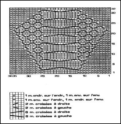 Suivre la grille. Après le 32ème rg, reprendre au 1er rg.2 m. croisées à droite: glis. 1 m. sur l'aig. aux. derrière le travail, tric. la m. suiv.e ndr. puis à l'endr. la m. de l'aig. aux.
