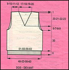 Monter pour chaque devant 80 - 84 - 88 - 92 m. et pour le dos 64 - 68 - 72 - 76 m. Tric. 3 cm côtes 2/2 et laisser en attente.
