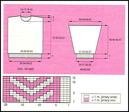 Monter 65 - 67 - 71 - 73 m. Tric. 7 cm côtes 1/1 en répart. 12 - 14 - 16 - 18 augm. au dernier rg. Cont. point fantaisie sur les 77 - 81 - 87 - 91 m. obtenues en commençant: