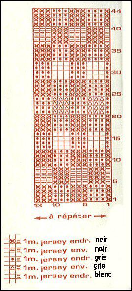 Comme le dos, mais à 30 - 32 - 34 cm de haut. tot., cont. jacquard en suivant la grille. Après le 44ème rg, term. jersey endr. en gris.