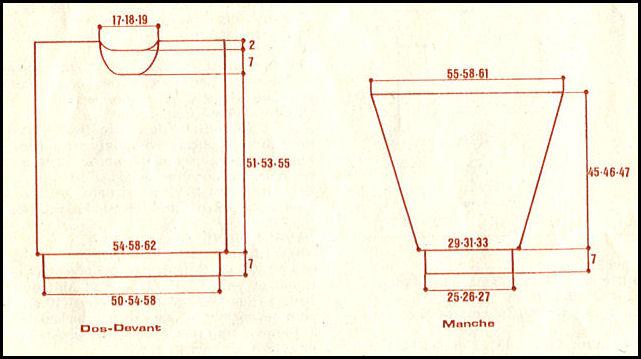 À 58 - 60 - 62 cm de haut. tot., rab. les 7 - 9 - 11 m. centrales. Term. ch. partie séparément en rab. côté encolure ts les 2 rgs, 2 fs 3 m., 1 fs 2 m., 3 fs 1 m.