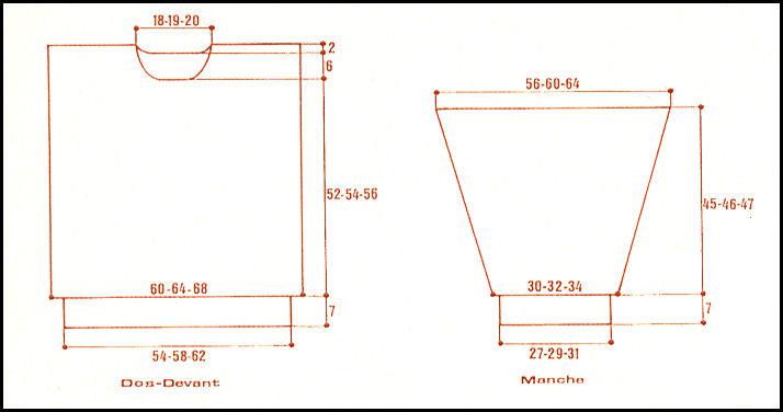 Monter 105 - 113 - 121 m. Tric. 7 cm côtes 1/1 en répart. 40 - 43 - 45 augm. au dernier rang. Cont. droit comme suit les 145 - 156 - 166 m. obtenues:
