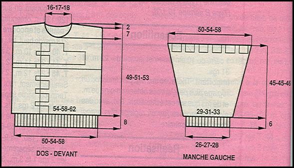 Faire les coutures d'épaules. Poser les manches au point de mailles sur 25 - 27 - 29 cm de part et d'autre des coutures d'épaules. Poser le col au point de mailles au bord de l'encolure. Term. les coutures.