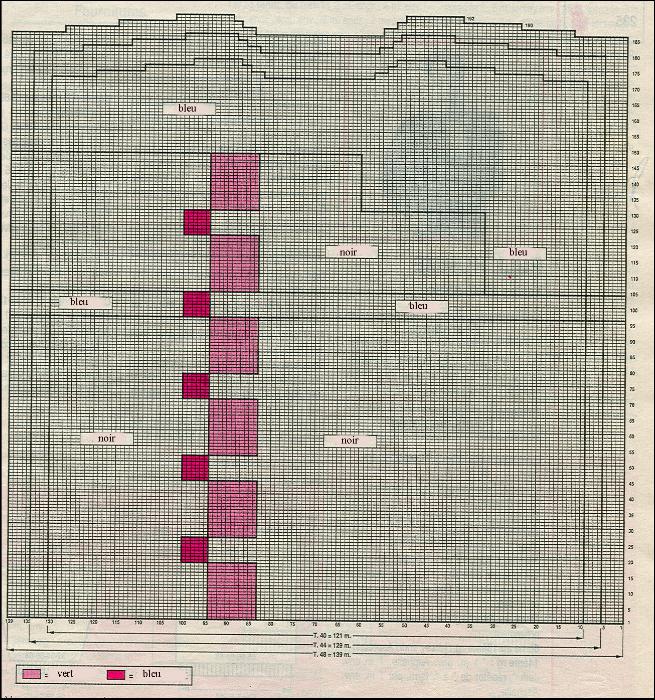 Monter 113 - 121 - 131 m. en bleu, puis 6 cm en noir en répart. 8 augm. au dernier rg. Cont. droit jacquard en suivant la grille sur les 121 - 129 - 139 m. obtenues.