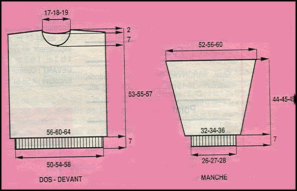 Monter 52 - 54 - 56 m. avec la laine "A". Tric. 7 cm còtes 2/2 en répart. 18 - 20 - 22 augm. au dernier rg. Cont. au point fant. sur les 70 - 74 - 78 m. obtenues en augm. de ch. côté: