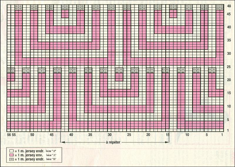 Point fantaisie: aig. # 4, suivre la grille. Après le 48ème rg, répéter du 1er au 48àme rg, mais en remplaçant les m. jersey endr. avec la laine "B" par la laine "A"