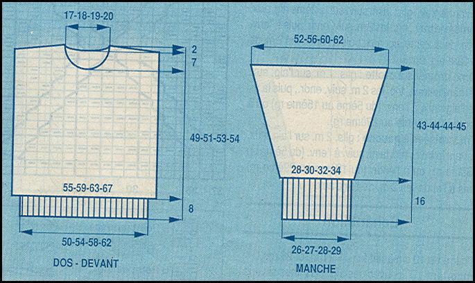 Monter 54 - 56 - 58 - 60 m. Tric. 16 cm côtes 2/2 en répart. 4 - 6 - 8 - 10 augm. au dernier rang. Cont. jersey endr. sur les 58 - 62 - 66 - 70 m. obtenues.