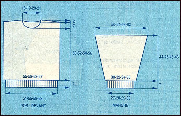 Monter 53 - 55 - 57 - 59 m. Tric. 7 cm côtes 1/1 en répart. 6 - 8- 10 - 12 augm. au dernier rg. Cont. en jersey endr. sur les 59 - 63 - 67 - 71 m. obtenues.