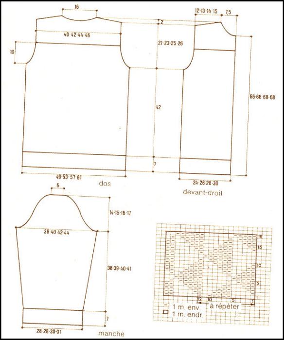 Monter 28 - 30 - 34 - 36 m. Tric. 7 cm côté 2/2. cont. droit point fant. en commençant à droite par la m. 6 de la grille.