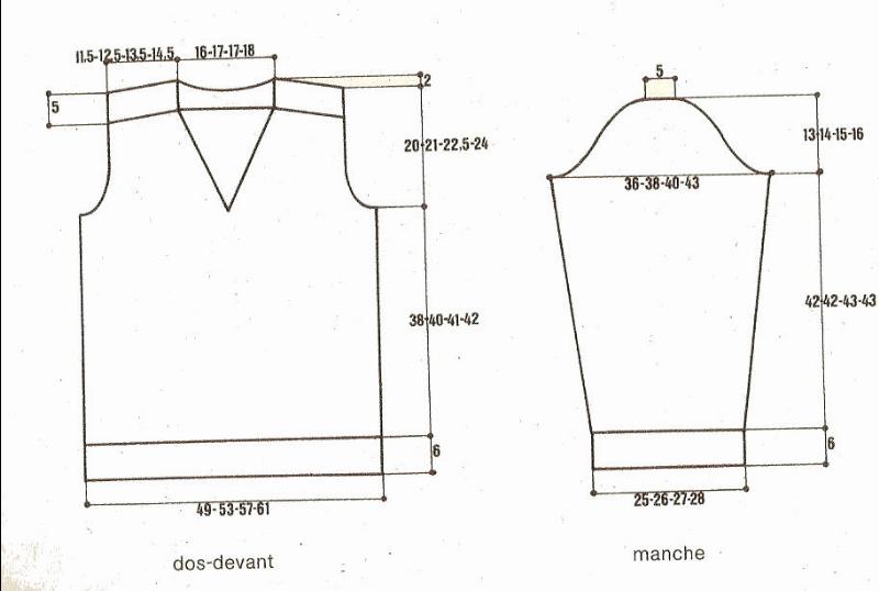 À 20 - 21 - 22.5 - 24 cm de haut. d'emmanchures, fermer les 18 - 20- 20 - 22 m. centrales. Cont. ch. côté séparément en rab. côté encolure ts les 2 rgs 1 fs 3 m., 1 fs 2 m. Fermer les 21 - 23 - 25 - 27 m. rest. en 1 fois.