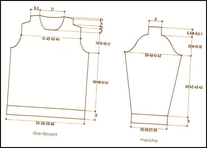 À 14 - 15 - 16 - 17 cm de haut. d'emmanchures, fermer les 14 m. centrales. Cont. ch. côté séparément en rab. côté encolure ts les 2 rgs: 2 fs 3 m., 3 fs 2 m., 4 fs 1 m.