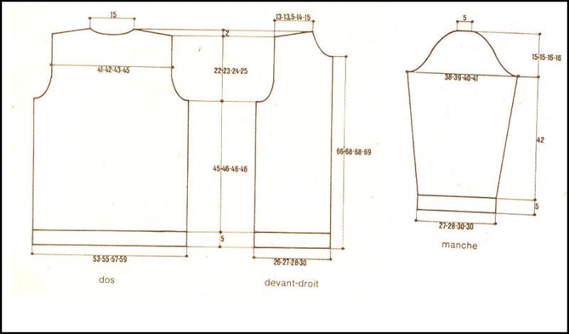 Monter 70 - 74 - 74 - 78 m. Tric. 12 cm en côtes 2/2, puis rab. de ch. côté ts les 2 rgs 2 fs 11 - 12 - 12 - 13 m. Fermer les mailles restantes en 1 fois.