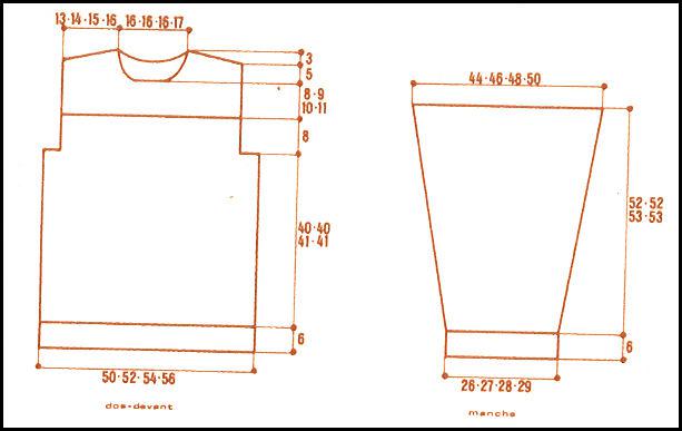 À 16 - 17 - 18 - 19 cm de haut. d'emmanchures, fermer les 13 - 13 - 13 - 15 m. centrales. Cont. ch. côté séparément en ra.b côté encolures ts les 2 rgs: 1 fs 3 m., 2 fs 2 m., 4 fs 1 m.