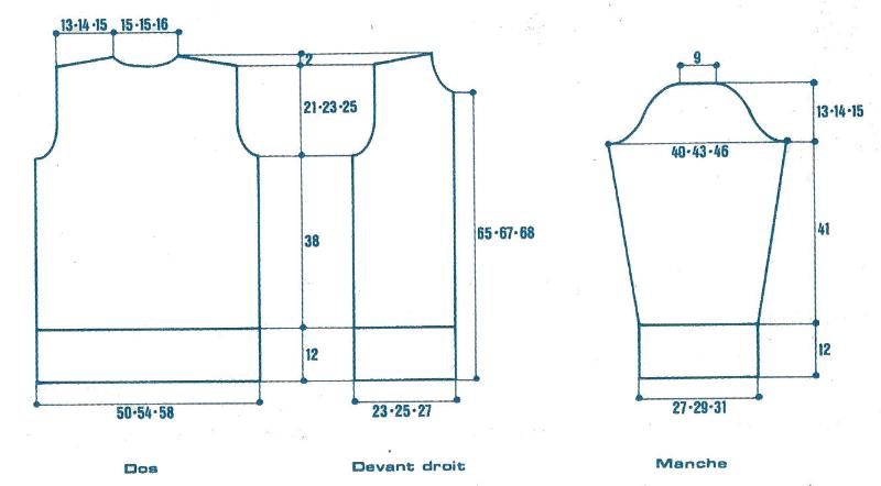 Monter 31 - 33 - 35 m. Tric. droit en côtes perlées 16 - 18 - 20 cm, puis dim. à gauche pour l'épaule