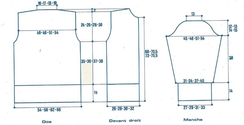 Au bord de l'encolure, rel. 89 - 93 - 97 - 101 m. Tric. 14 cm au point de blé, ne pas rab., mais replier le col par moitié en dehors et poser au point de mailles.