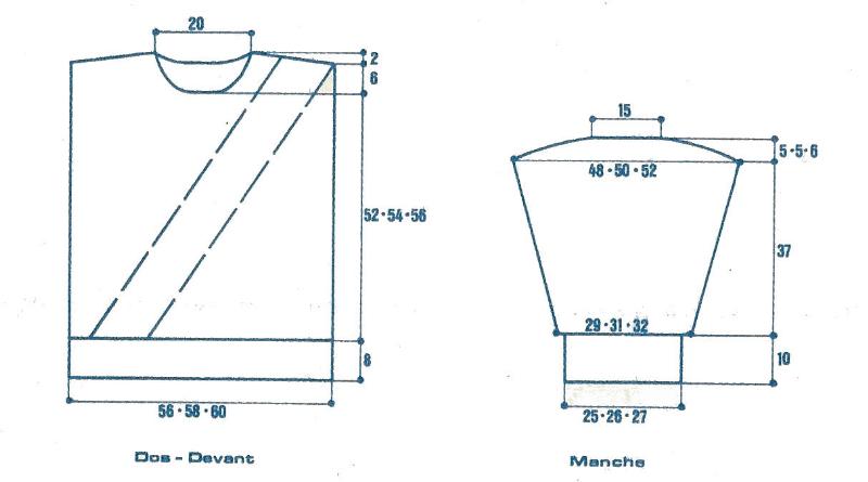 À 60 - 62 - 64 cm de haut. tot., fermer les 21 m. centrales. Cont. ch. côté séparément en rab. côté encolure ts les 2 rgs 1 fs 4 m., 1 fs 3 m., 1 fs 2 m., 3 fs 1 m.