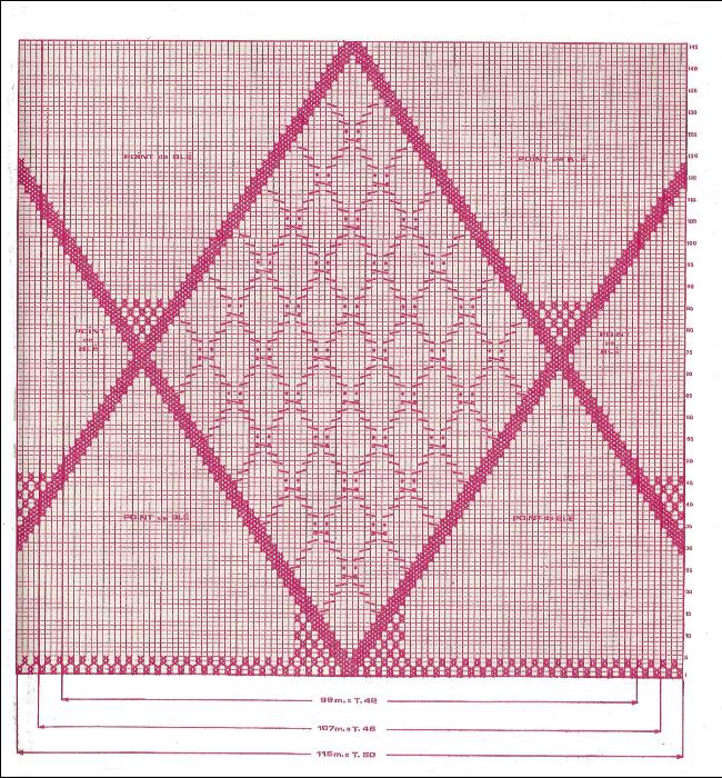 Monter 48 - 52 - 56 m. Tric. 6 cm en côtes 1/1. Cont. au point de blé en répart. au 1er rg 7 augm. puis en augm. de ch. côté dès le 3ème rg.