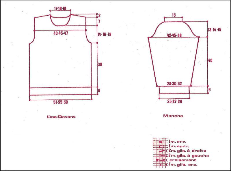 À 14 - 16 - 18 cm de haut. d'emmanchures, rab. les 11 - 13 - 15 m. centrales. Term. ch. partie séparément en rab. côté encolure ts les 2 rgs 1 fs 3 m., 3 fs 2 m., 2 fs 1 m.