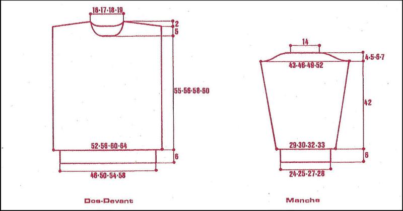 Monter 95 - 103 - 111 - 119 m. Tric. 6 cm en côtes 1/1 en répart. 12 augm. au dernier rg. Cont. au point fant. sur les 107 - 115 - 123 - 131 m. obtenues en tric. comme suit: