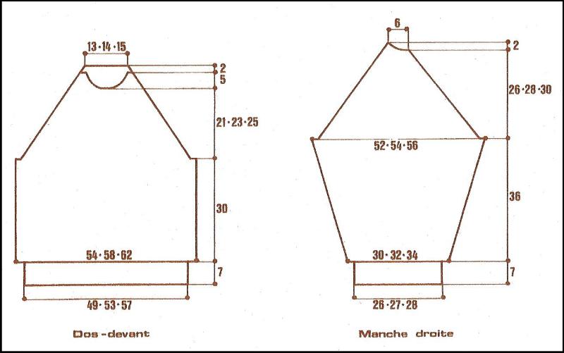 T.50: 5 fs 2 m., 47 fs 1 m.Pour dim. 2 m. à 2 m. du bord: à droite, tric. 2 m. endr., 3 m. endr. ens.; à gauche, 5 m. avant la fin du rg, tric. 1 S.D., 2 m. endr.