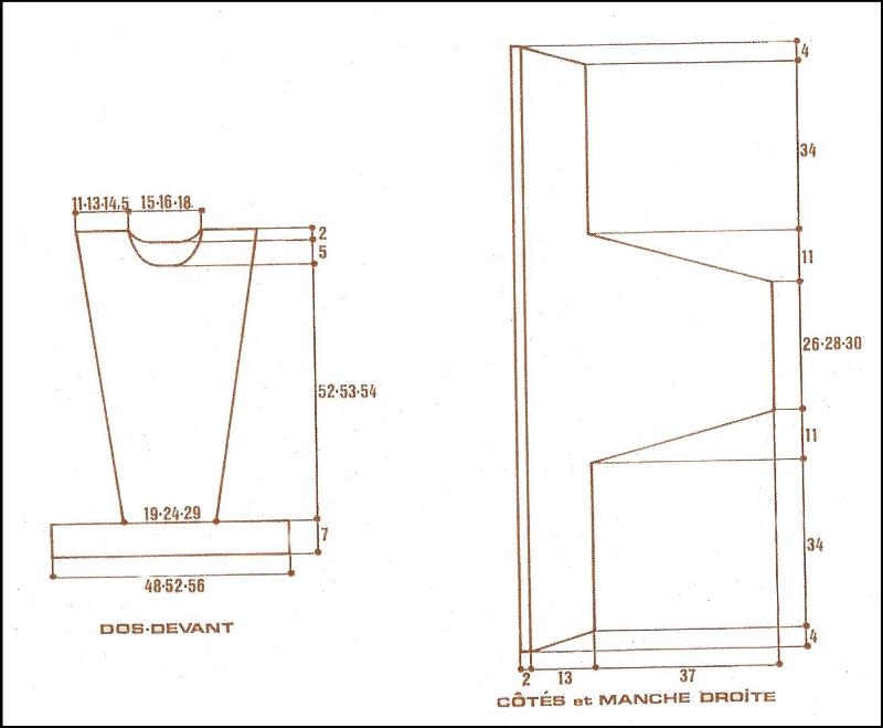 Monter 4 m. Tric. point fant. en augm. à droite ts les 2 rgs 6 fs 4 m. Cont. droit sur les 28 m. obtenues. À 38 cm de haut. tot., augm. à droite ts les 2 rgs 2 fs 6 m., 13 fs 5 m. Cont. droit sur les 105 m. obtenues pendant 26 - 28 - 30 cm puis rab. à droite ts les 2 rgs 13 fs 5 m., 2 fs 6 m. Cont. droit sur les 28 m. rest. pendant 34 cm puis rab. à droite ts les 2 rgs 7 fs 4m.