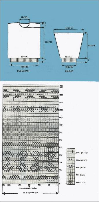 Monter 91 - 97 - 105 m. en gris fer. Tric. 7 cm en côtes 1/1 en répart. 12 augm. au dernier rg. Cont. droit en jacquard sur les 103 - 109 - 117 m. obtenues en commençant: