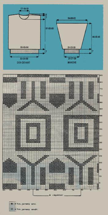 Monter 62 - 66 - 70 m. Tric. 7 cm en côtes 2/2 en répart. 13 - 13 - 15 augm. au dernier rang. Cont. au point fant. sur les 75 - 79 - 85 m. obtenues en commençant: