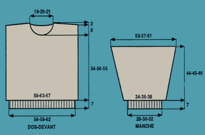 Monter 31 - 33 - 35 m. Tric. 7 cm en côtes 1/1 en répart. 7 - 9 - 9 augm. au dernier rang. Cont. au point fant. sur les 38 - 42 - 44 obtenues.