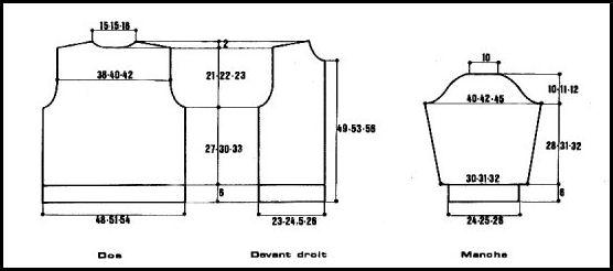 Monter 73 - 79 - 83 m. Tric. 3 cm côtes 1/1. Laisser en attente mais à la bordure droite ouvrir à mi-haut. 5 boutonnières de 2 m., la 1ère à 4 m. du bord, les autres espacées de 12 - 13 - 14 m.