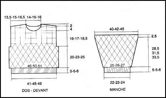 À 25 - 28 - 31 cm de haut. tot. rab. de ch. côté 1 fs 6 m. Cont. droit sur les 91 - 101 - 109 m. rest. À 31.5 - 31.5 - 32.5 cm de haut. tot. (après un 26ème rg de la grille) tric. comme suit en augm. 1 m. pour T.8 et 12 ans: