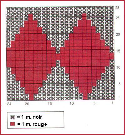 Suivre la grille pour losanges. Après le 28ème rg reprendre au 1er rang. Prendre un peloton par motif et bien croiser les fils à chaque changement de coloris pour éviter les fils sur l'envers.