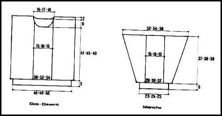 À 46 - 50 - 54 cm de haut. tot., rab. les 13 - 15 - 13 centrales. Cont. ch. côté séparément en rab. côté encolure ts le 2 rgs 1 fs 4 m., 1 fs 3 m., 1 fs 2 m., 4 fs 1 m.