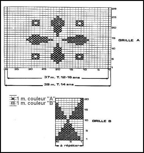 Monter 107 - 111 - 115 m. couleur "A", tric. 5 cm côtes 1/1 en répart. 16 augm. au dernier rang. Cont. droit jacquard grille "B" sur les 123 - 127 - 131 m. obtenues. Commencez alors