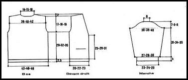 Monter 45 - 47 - 49 m. Tric. 4 cm côtes 1/1 en répart. 9 - 9 - 11 augm. au dernier rg. Cont. comme au dos sur les 54 - 56 - 60 m. obtenues mais pour