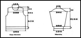 T.14 ans: 28 m. torsadées en commençant par 1 m. endr. torse, 2 m. env., 1 m. endr. torse, 17 m. croisées à droite, 10 m. torsadées, 8 m. torsade, 10 m. torsadées, 16 m. du motif central, 10 m. torsadées, 8 m. torsade, 10 m. torsadées, 17 m. croisées à gauche, 28 m. torsadées en term. par 1 m. endr. torse, 2 m. env., 1 m. endr. torse.Emmanchures: