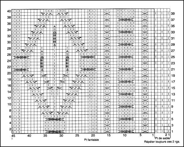 Point de sable et côtes fantaisie: voir diagramme et légendePanneau central devant: tric. le point fantaisie de la 1ère à la 45ème m., puis de la 1ère à la 18ème m. du diagramme = 63 m.