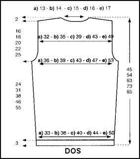 de hauteur après les côtes, tric. le losange (voir diagramme: du 5ème au 40ème rg). Le losange terminé, répéter toujours les 4 premiers rgs.À: A) 24 cm (72 rgs) B) 31 cm (94 rgs) C) 38 cm (114 rgs) D) 46 cm (138 rgs) E) 55 cm (166 rgs)